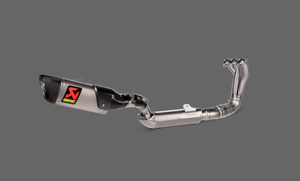 This system is constructed using race-proven materials. The high-grade titanium muffler outer sleeve is coupled with stainless-steel link pipes and headers and is finished with a hand-crafted carbon-fibre end cap and a double heatshield. The new design features a shorter muffler for an enhanced sporty look, which exits on the side of the bike for visual impact. Power is increased by 1.5 kW (2.0 hp) at 10,000 rpm and torque is up by 1.3 Nm at 9,700 rpm when compared in back-to-back tests on a Tracer 9 with a Racing Line (Titanium) exhaust and with a standard stock exhaust system. It creates a deep and intense sound.