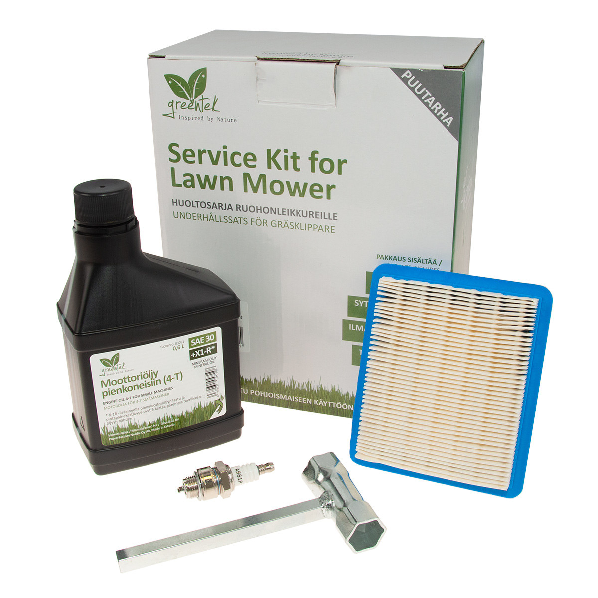 Greentek maintenance packages contain everything essential for basic maintenance of the mower. All neatly in one package.