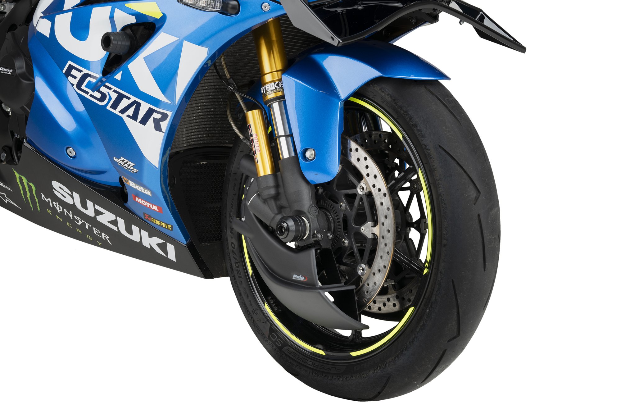 Its studied design, in addition to providing a more sporty and personalized aesthetic, eliminates turbulence at the front wheel by creating a partial lenticular cover that favors the motorcycle’s aerodynamics, especially at high speeds. Includes sturdy, lightweight aluminum brackets finished in discreet textured black.