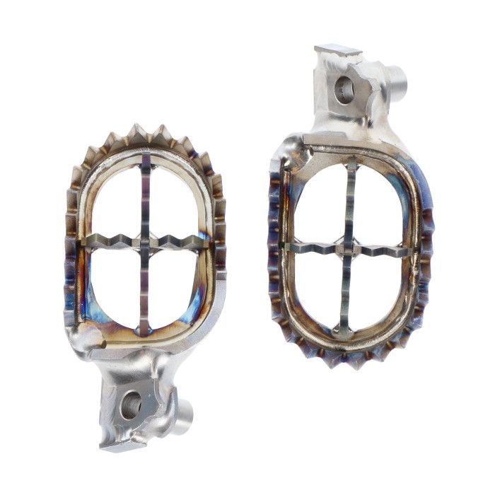 Titanium is a strong and lightweight metal that is often used in the construction of high-performance motorcycle components, including footpegs. Using titanium in the construction of footpegs may make them stronger and more durable while still being lightweight, which can be beneficial for performance and handling.